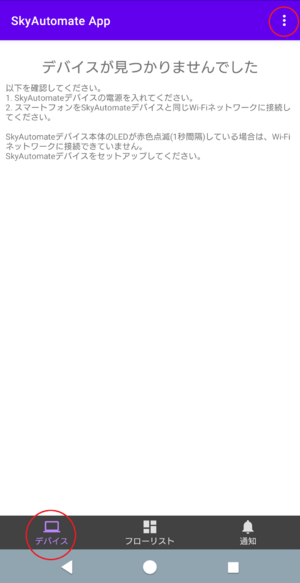 SkyAutomateデバイスが接続する Wi-Fiアクセスポイントと同じネットワークにスマートフォンを接続して、デバイスページを表示し、SkyAutomateデバイスが表示されるかを確認してください。表示されない場合は下方向にスワイプして更新してください。